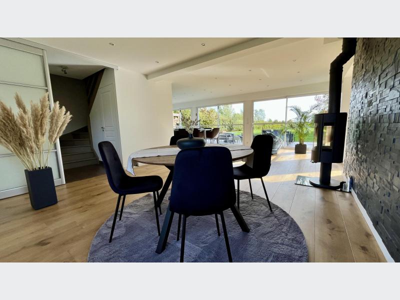 La cuisine équipée, à la fois moderne et fonctionnelle, s’intègre harmonieusement à cet espace convivial.