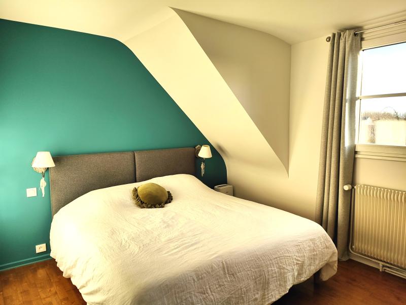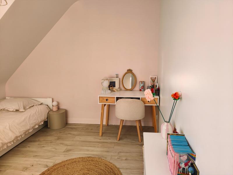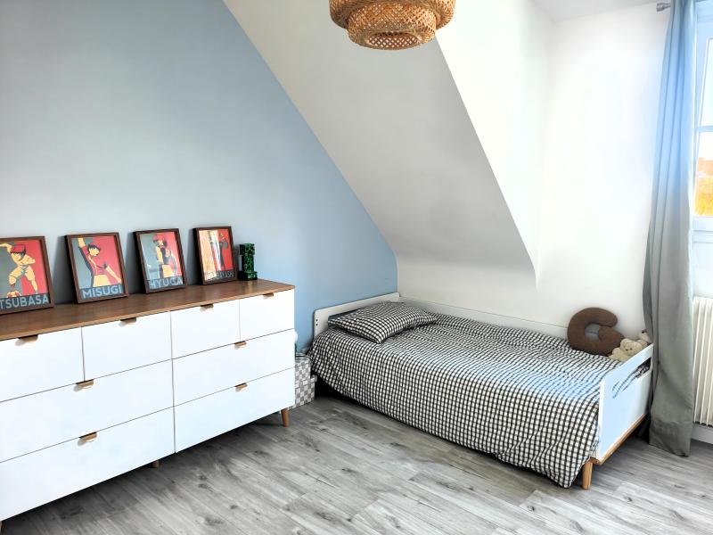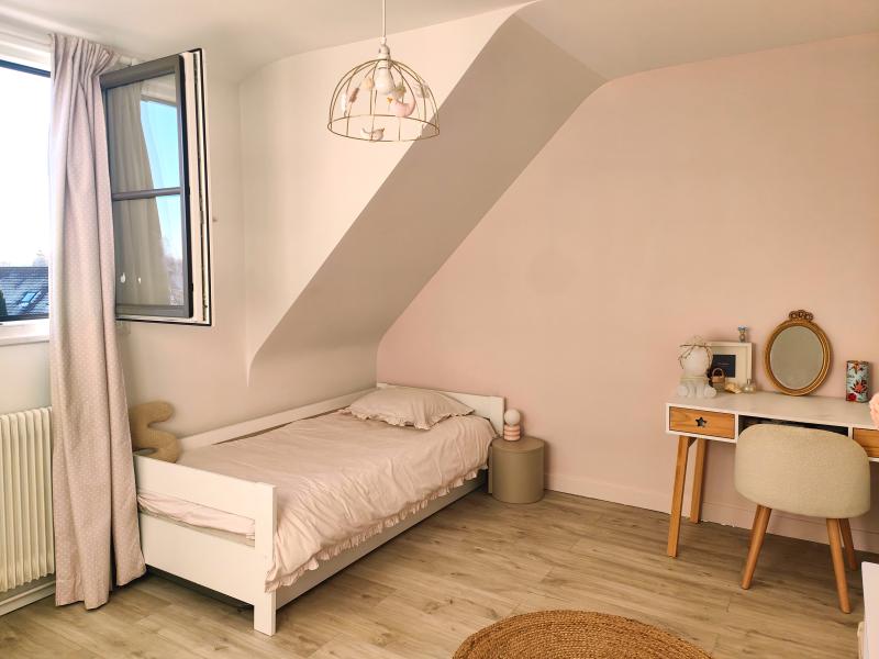 À l’étage, l’espace nuit se compose d’une salle de bains et de trois belles chambres parquetées.
