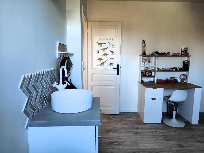Au rez-de-chaussée, vous serez accueillis par une belle entrée desservant un bureau, un séjour spacieux et très lumineux, parquet PVC, agrémenté d’une cheminée avec insert, ainsi qu’une cuisine équipée prolongée par un cellier avec accès direct à la terrasse.
