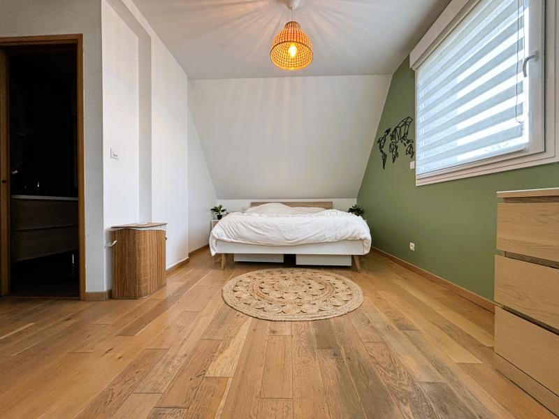 À l’étage : mezzanine, deux chambres, salle de bain et suite parentale avec dressing et salle de douche.